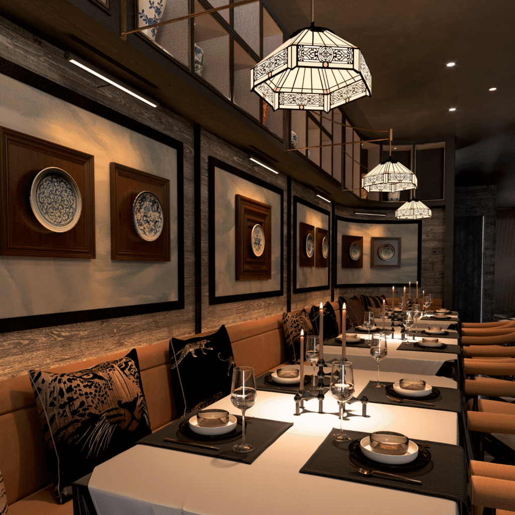 Each dining zone is meticulously planned to balance luxury with intimacy — from cozy tables set for elegant gatherings to open areas designed for a fluid dining experience. The interior palette harmonizes high-contrast tones, refined lighting, and minimalist decor, creating a seamless dialogue between modern art and culinary excellence.
