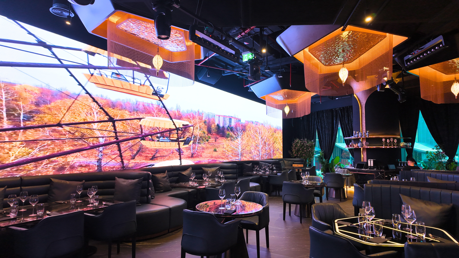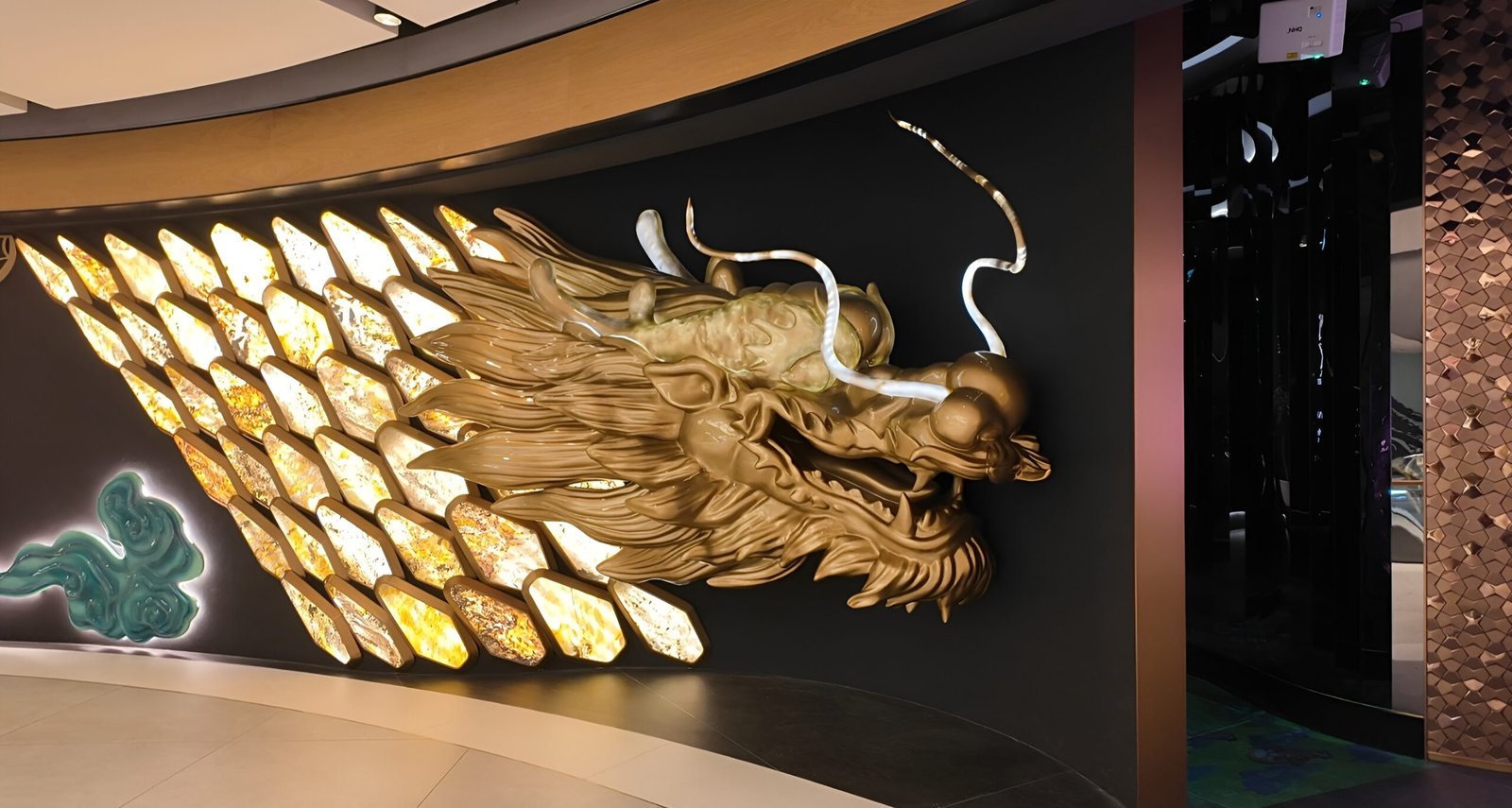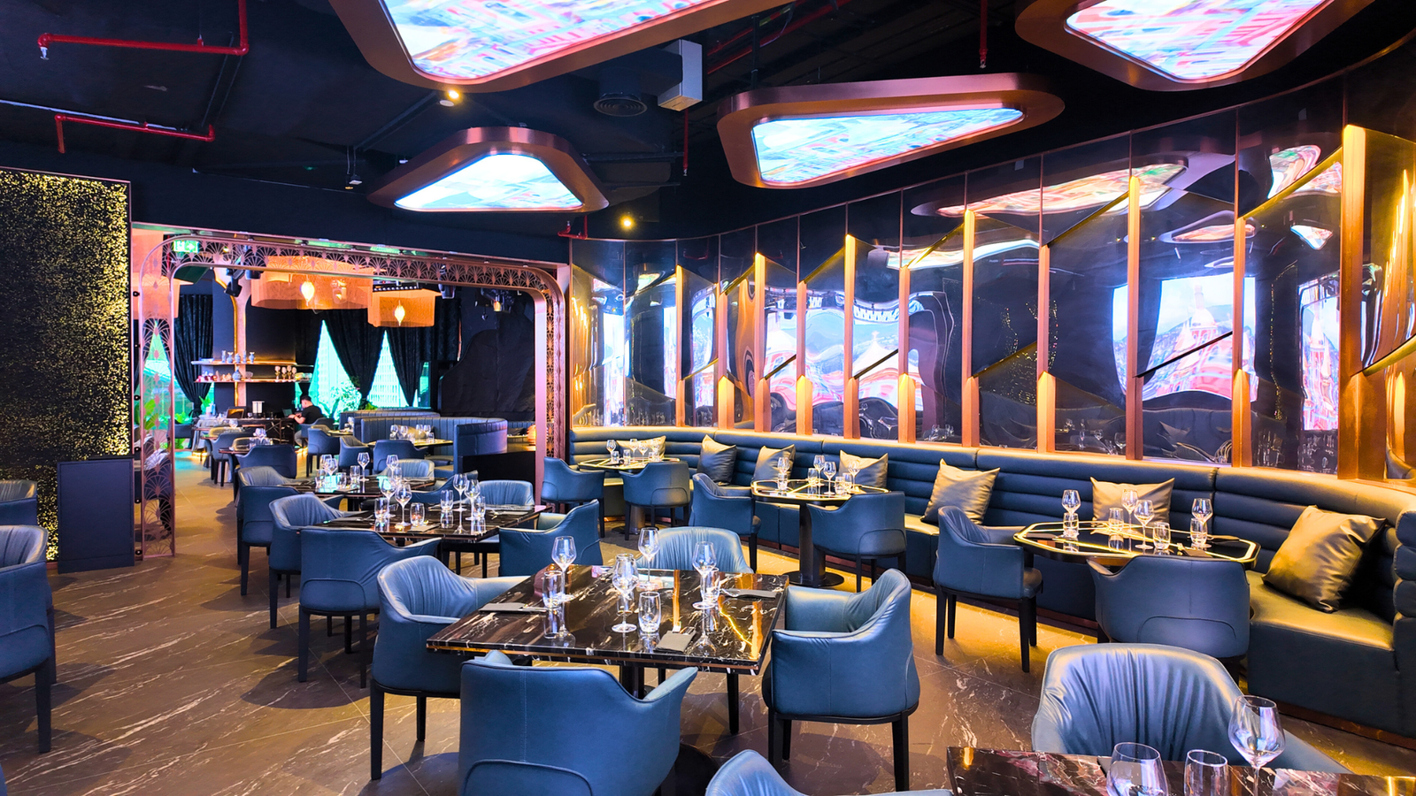 The interior design incorporates elements such as blue and white porcelain, Buddha statues, and dragon totems, as well as modern electronic holographic imagery, imbuing the restaurant with an Eastern ambiance while imbuing it with a futuristic, technological feel.