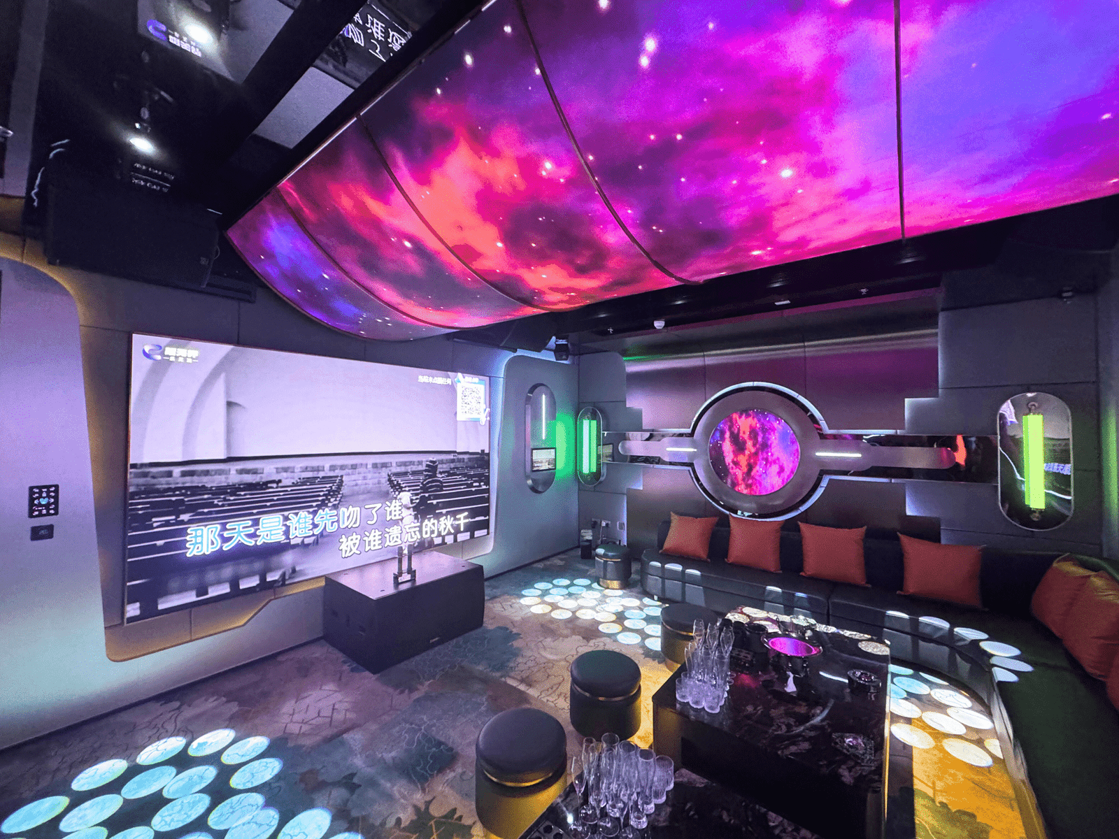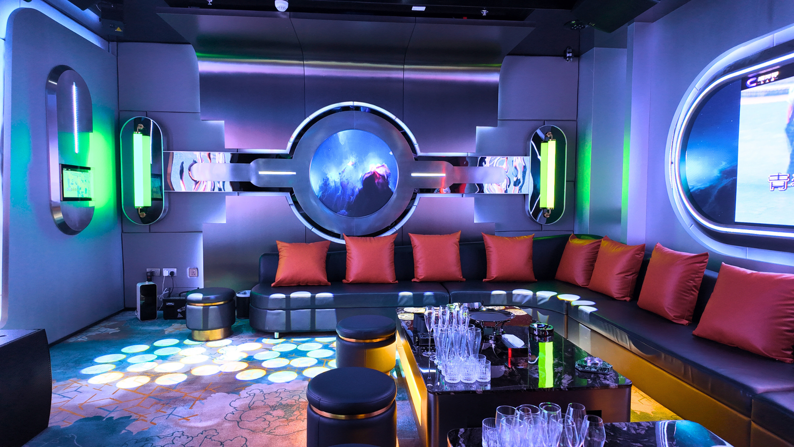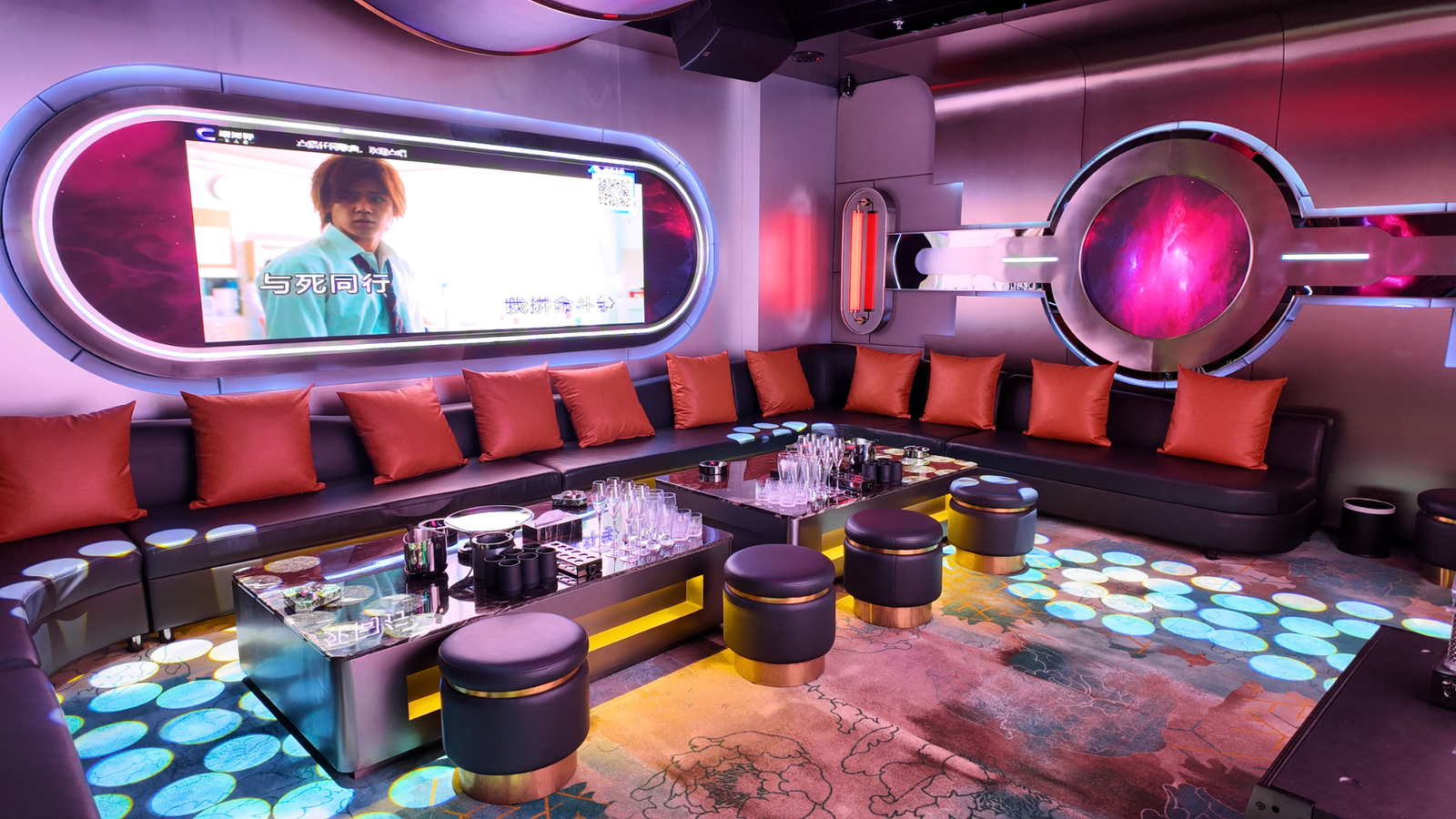 The interior design incorporates elements such as blue and white porcelain, Buddha statues, and dragon totems, as well as modern electronic holographic imagery, imbuing the restaurant with an Eastern ambiance while imbuing it with a futuristic, technological feel.
