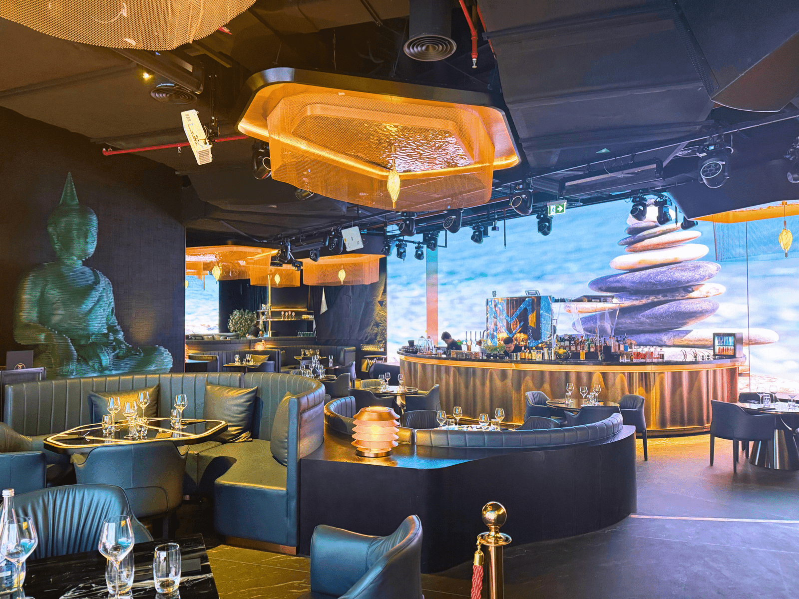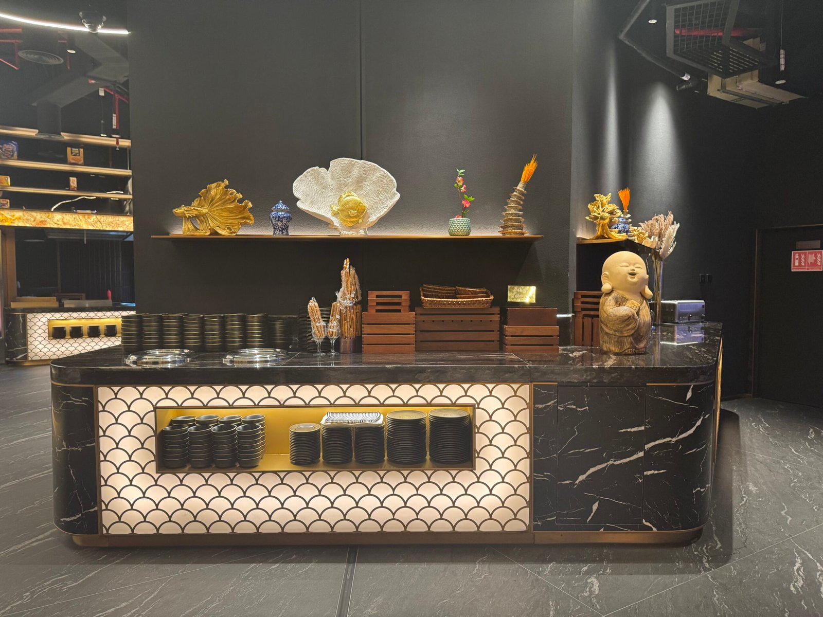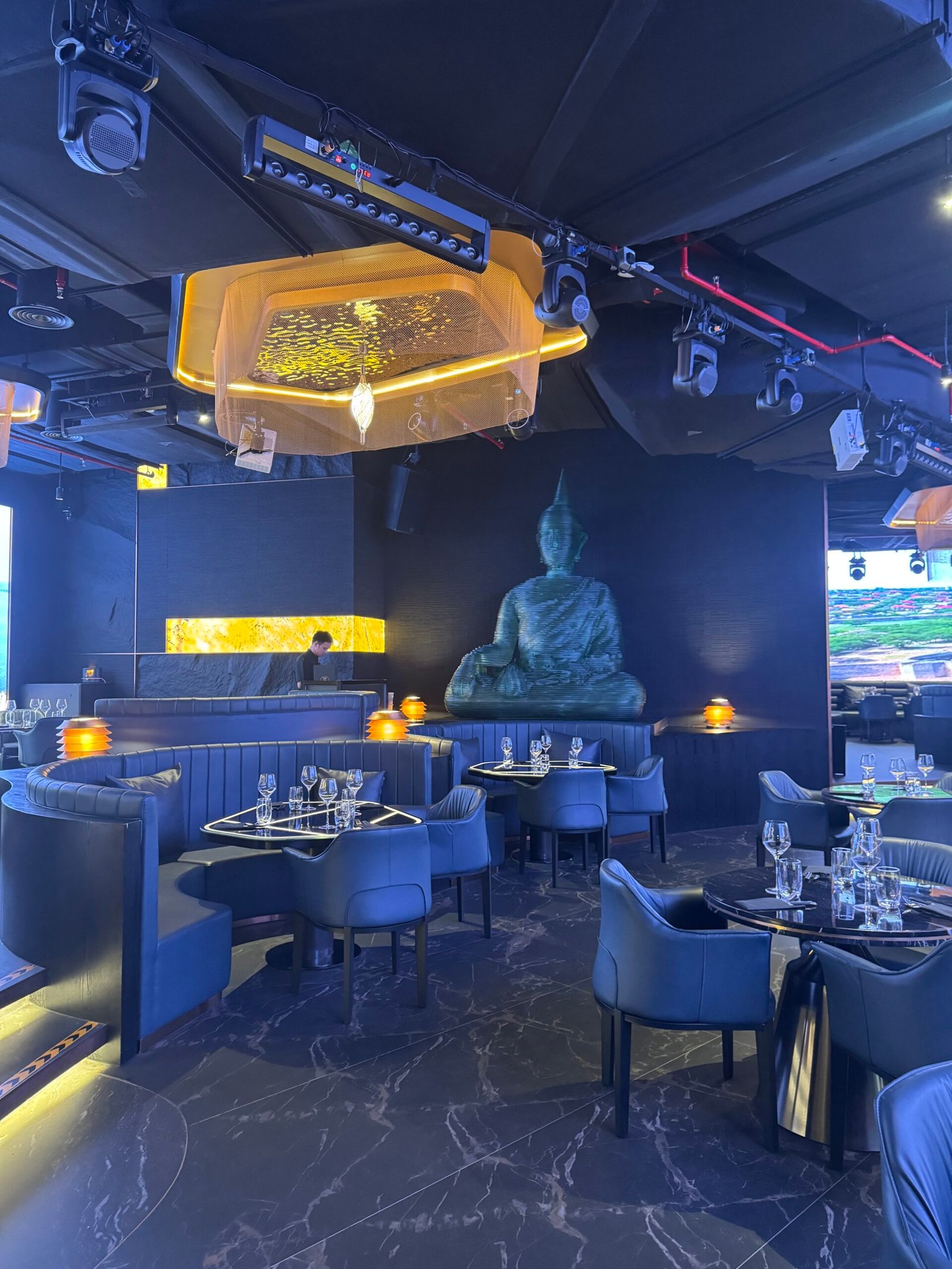 The restaurant’s corridors adorned with mirrors and grand paintings offer moments of reflection and artistry, while the central Buddha statue anchors the ambiance with peace and cultural depth. The interplay of traditional Eastern symbols and modern design innovation results in a space that is at once poetic, immersive, and technologically forward-thinking.