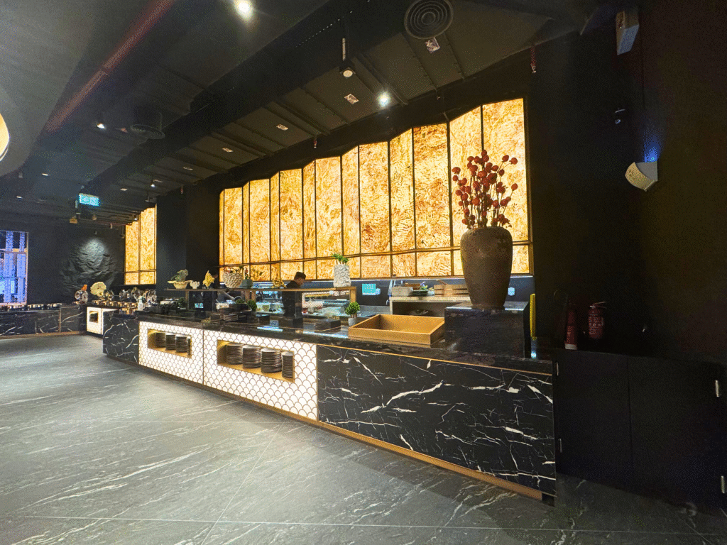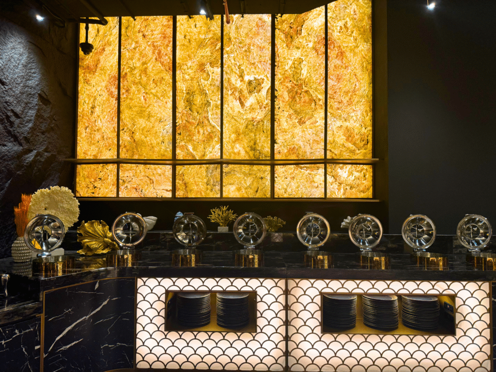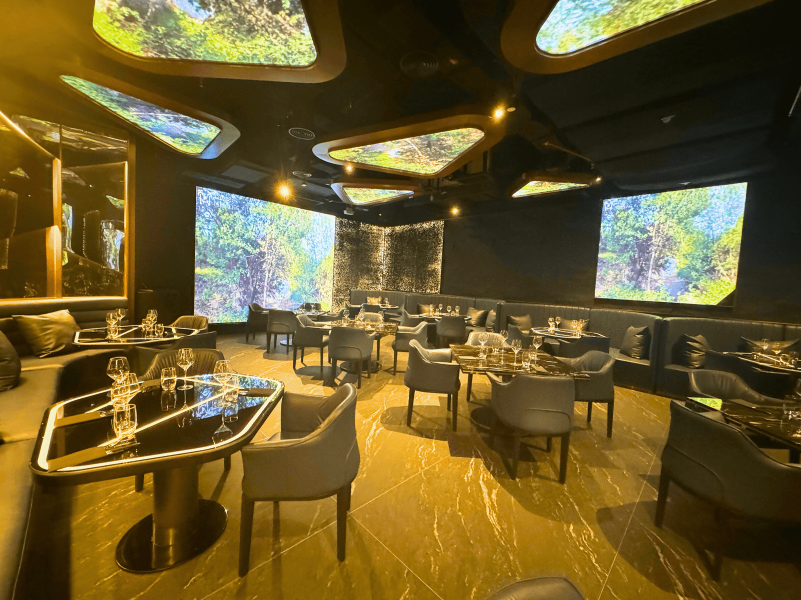 The restaurant’s corridors adorned with mirrors and grand paintings offer moments of reflection and artistry, while the central Buddha statue anchors the ambiance with peace and cultural depth. The interplay of traditional Eastern symbols and modern design innovation results in a space that is at once poetic, immersive, and technologically forward-thinking.