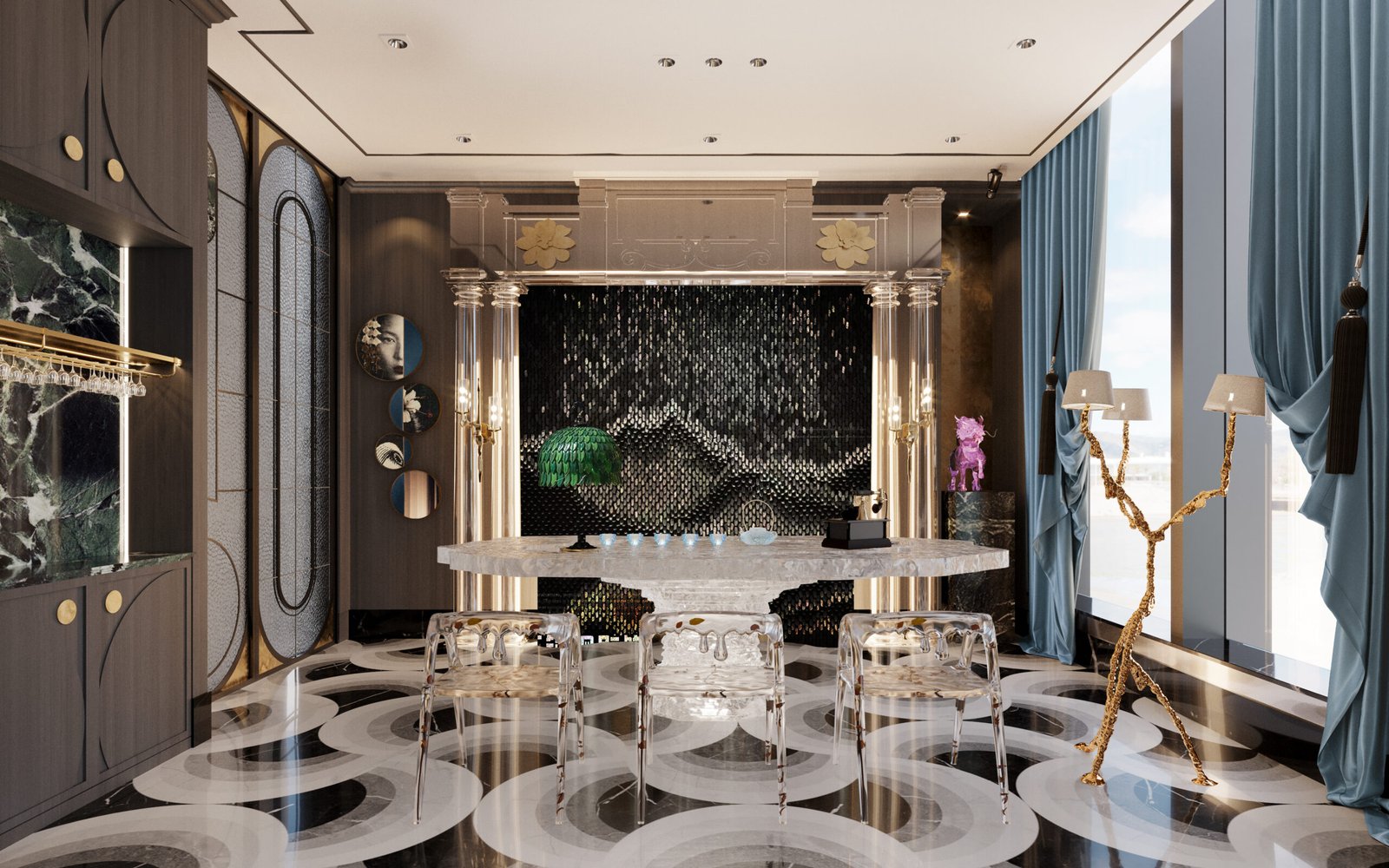 The interplay of marble, monochrome tones, and bespoke furnishings transforms the restaurant into a visual masterpiece.