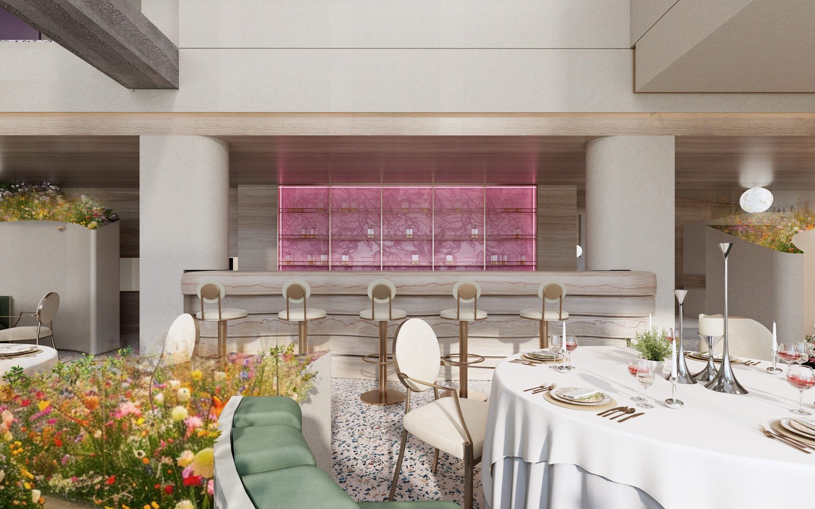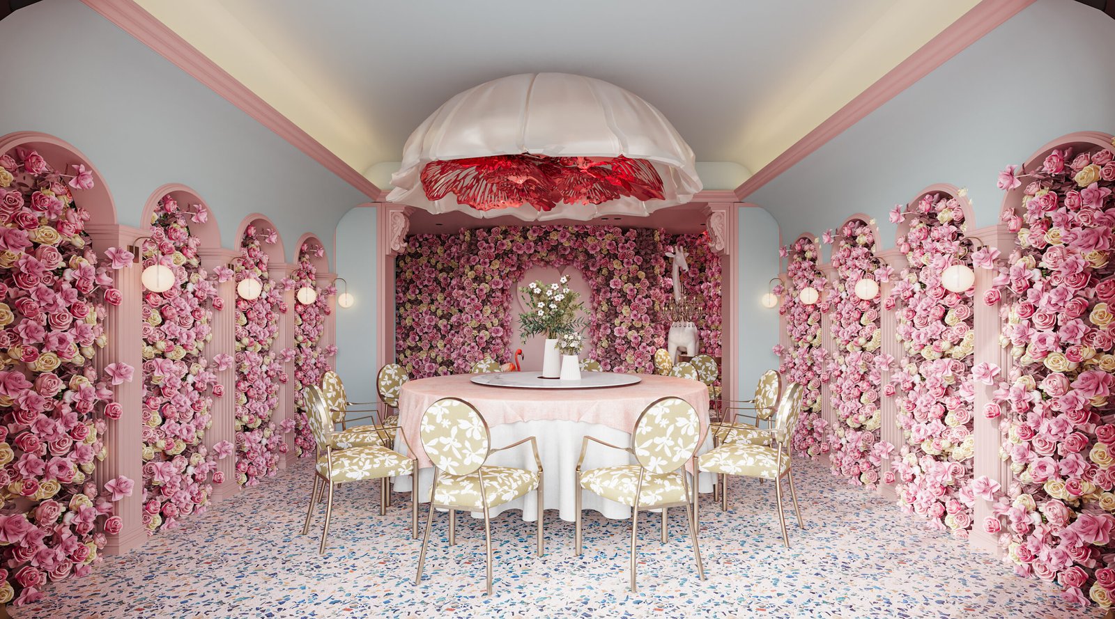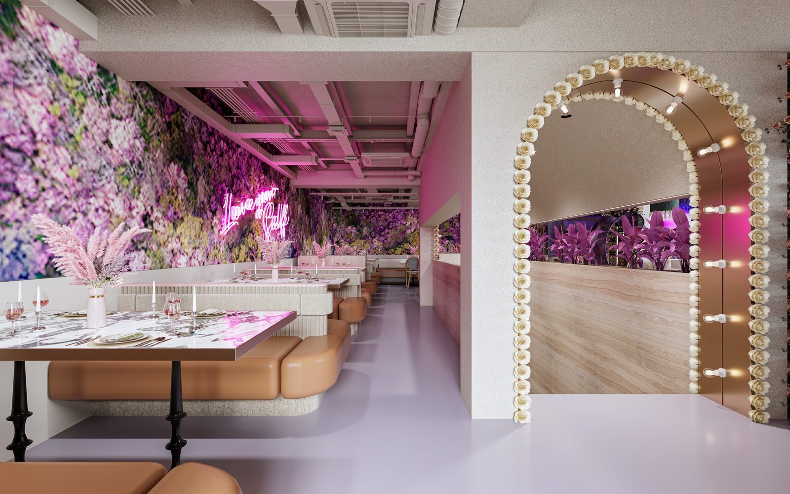 Beyond aesthetics, the layout is designed with spatial harmony and experiential flow. Each dining zone offers a distinct sensory encounter — from intimate seating framed by flower installations to open areas bathed in pink and gold tones under a grand chandelier. The thoughtful combination of lighting, textures, and colors ensures that every guest experiences comfort wrapped in visual delight.