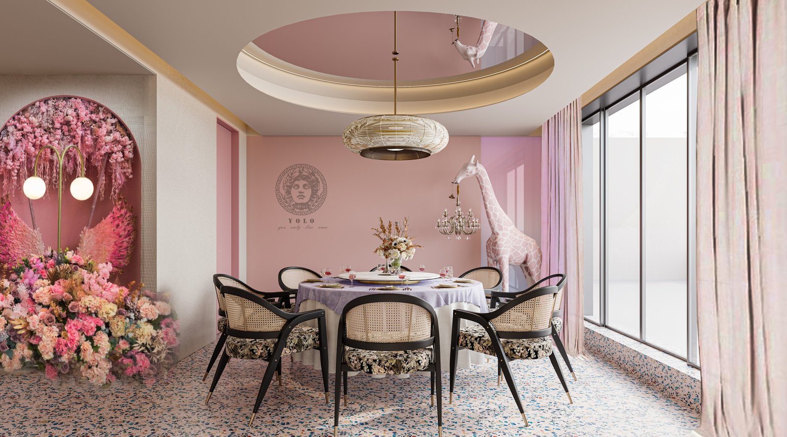 The interior concept draws inspiration from floral fantasy, playful storytelling, and contemporary global design trends. Soft pink interiors are layered with rich purple hues, blooming floral installations, and artistic murals to create a dynamic and joyful atmosphere. Statement elements such as the iconic giraffe centerpiece, mask-inspired wall art, and floral ceilings establish a strong visual identity that is both memorable and Instagram-worthy.