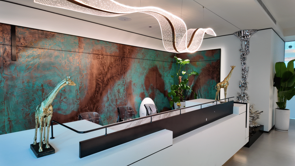 The project delivers a contemporary business environment shaped around modern art, minimalist aesthetics, and greenery, unifying these principles across reception, social areas, and workspaces.