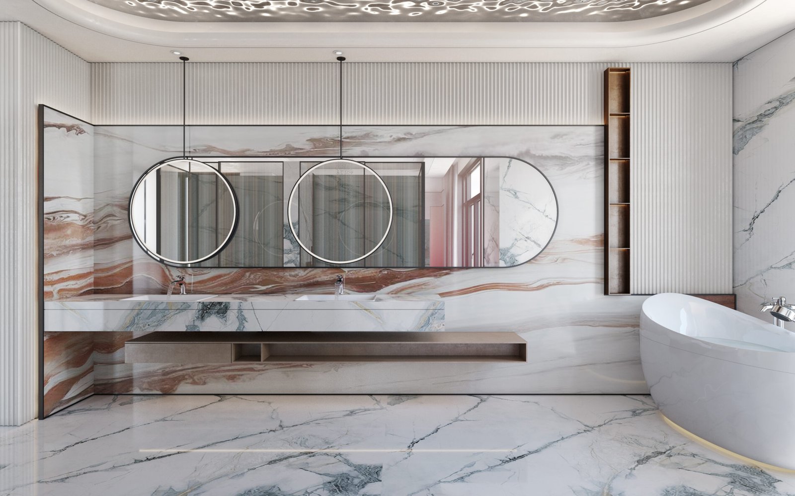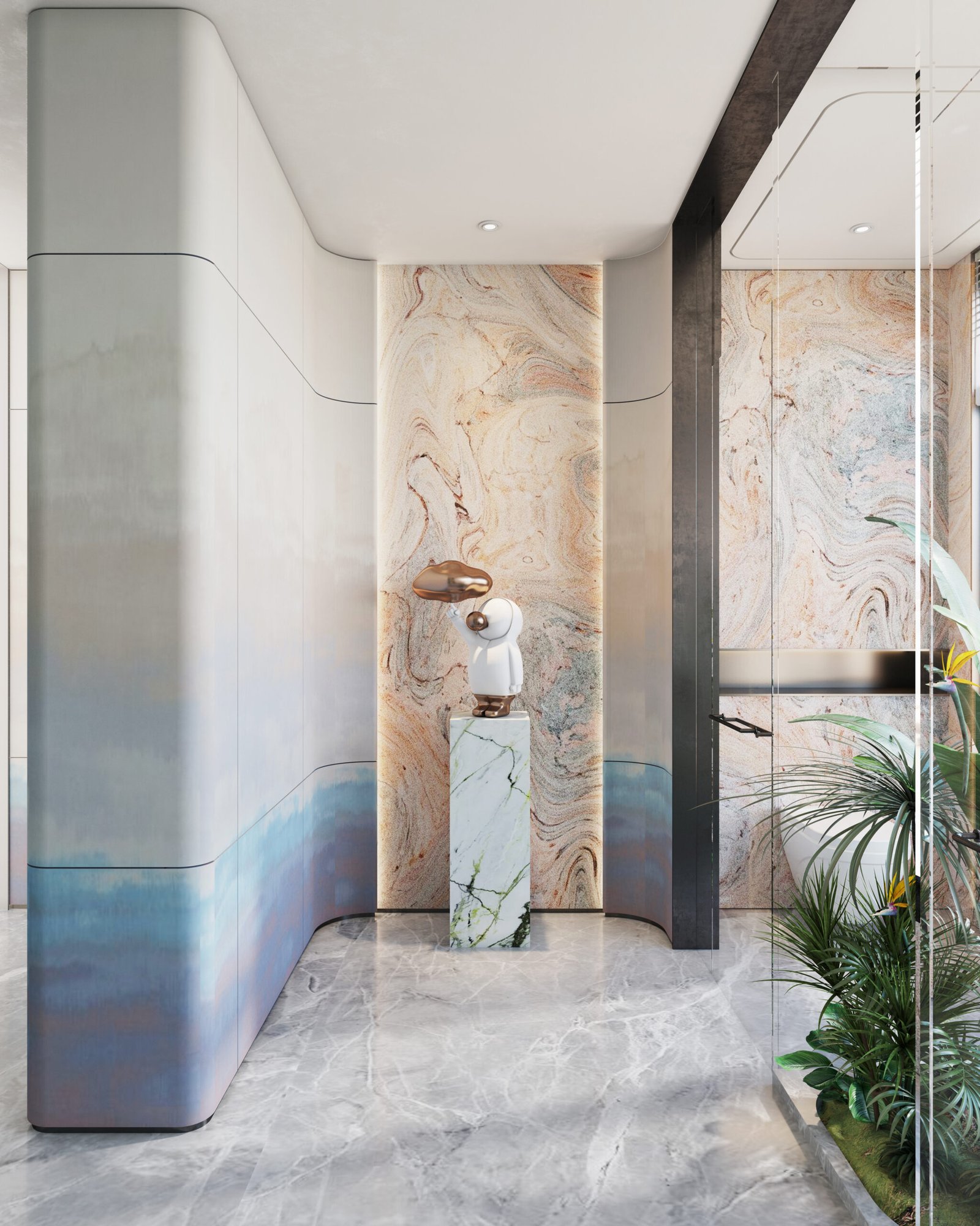 Hallways are designed with marble flooring and simple ceiling treatments, offering a clean and refined transition between spaces. A striking round wooden spiral staircase becomes a focal architectural feature, enhancing the villa’s visual appeal while connecting levels seamlessly.