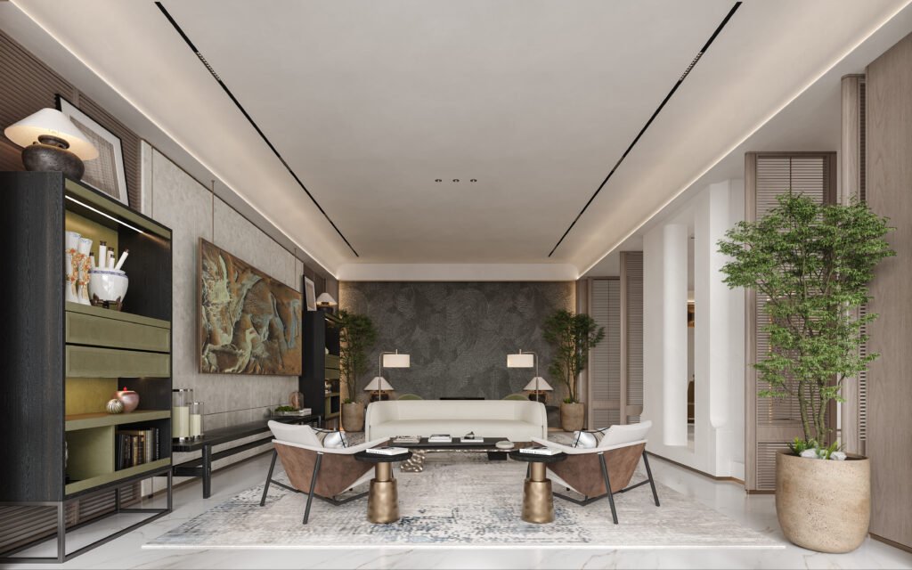 Living rooms are designed with balanced symmetry, neutral color palettes, marble floors, curated artwork, and plush seating. White and beige sofas, elegant lamps, and greenery create a serene yet upscale ambiance.