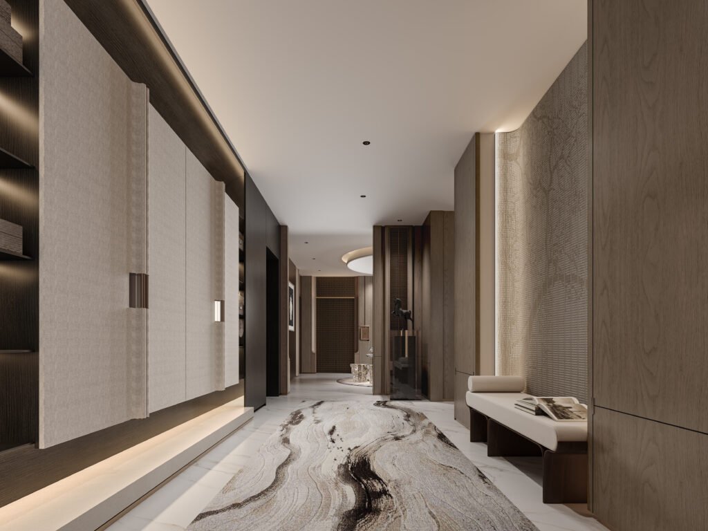 Sleek hallways feature marble flooring, textured wall panels, wooden cladding, and soft recessed lighting. Carefully placed benches, artwork, and lamps enhance both aesthetics and comfort while maintaining a minimalist luxury appeal.