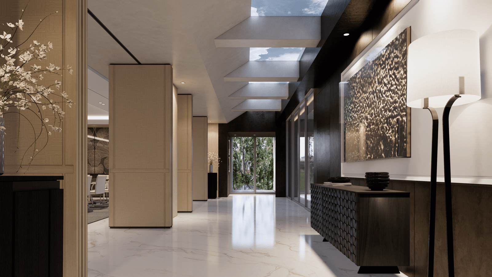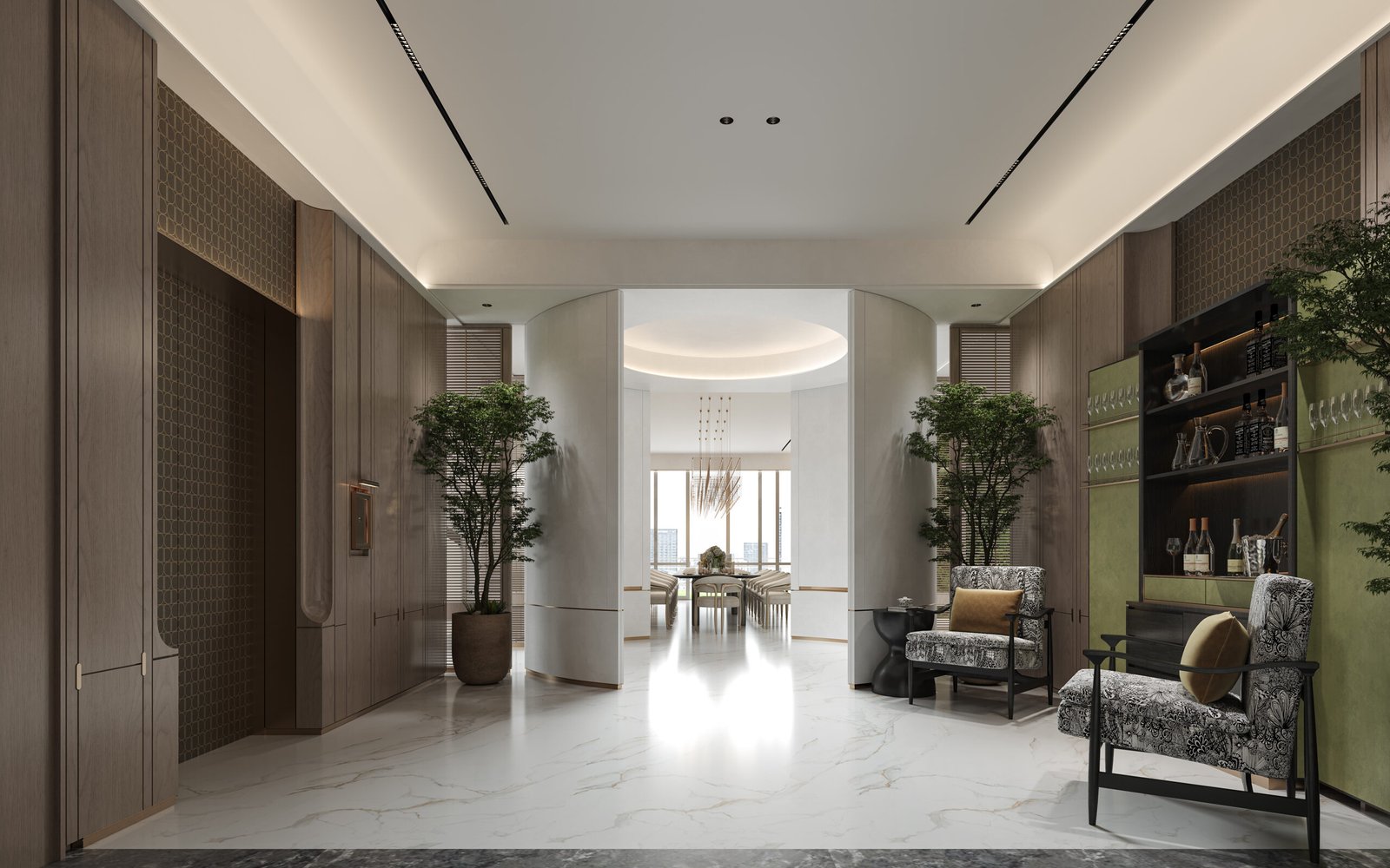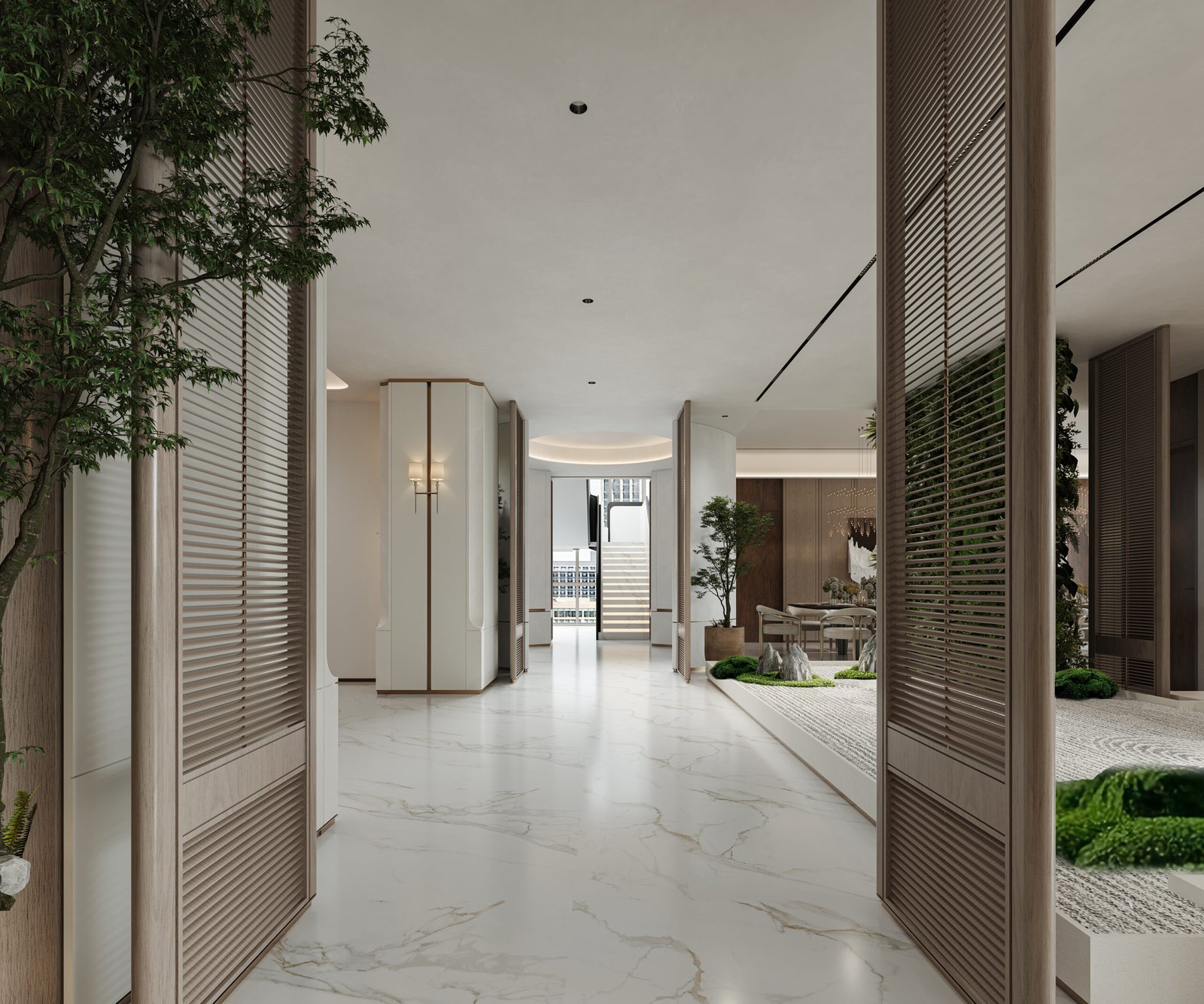 Sleek hallways feature marble flooring, textured wall panels, wooden cladding, and soft recessed lighting. Carefully placed benches, artwork, and lamps enhance both aesthetics and comfort while maintaining a minimalist luxury appeal.