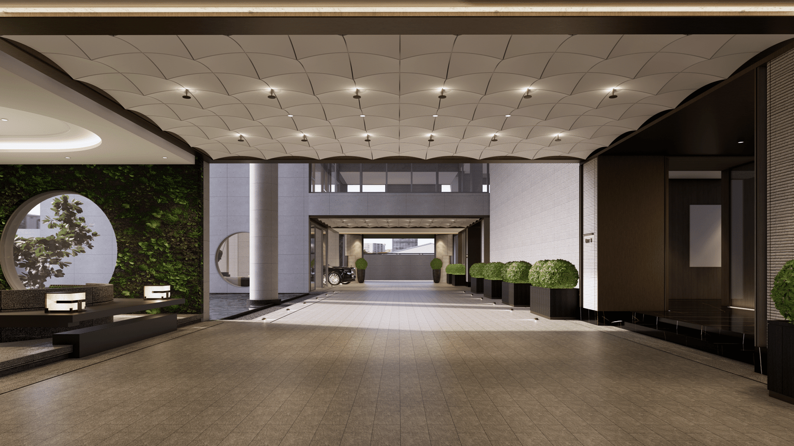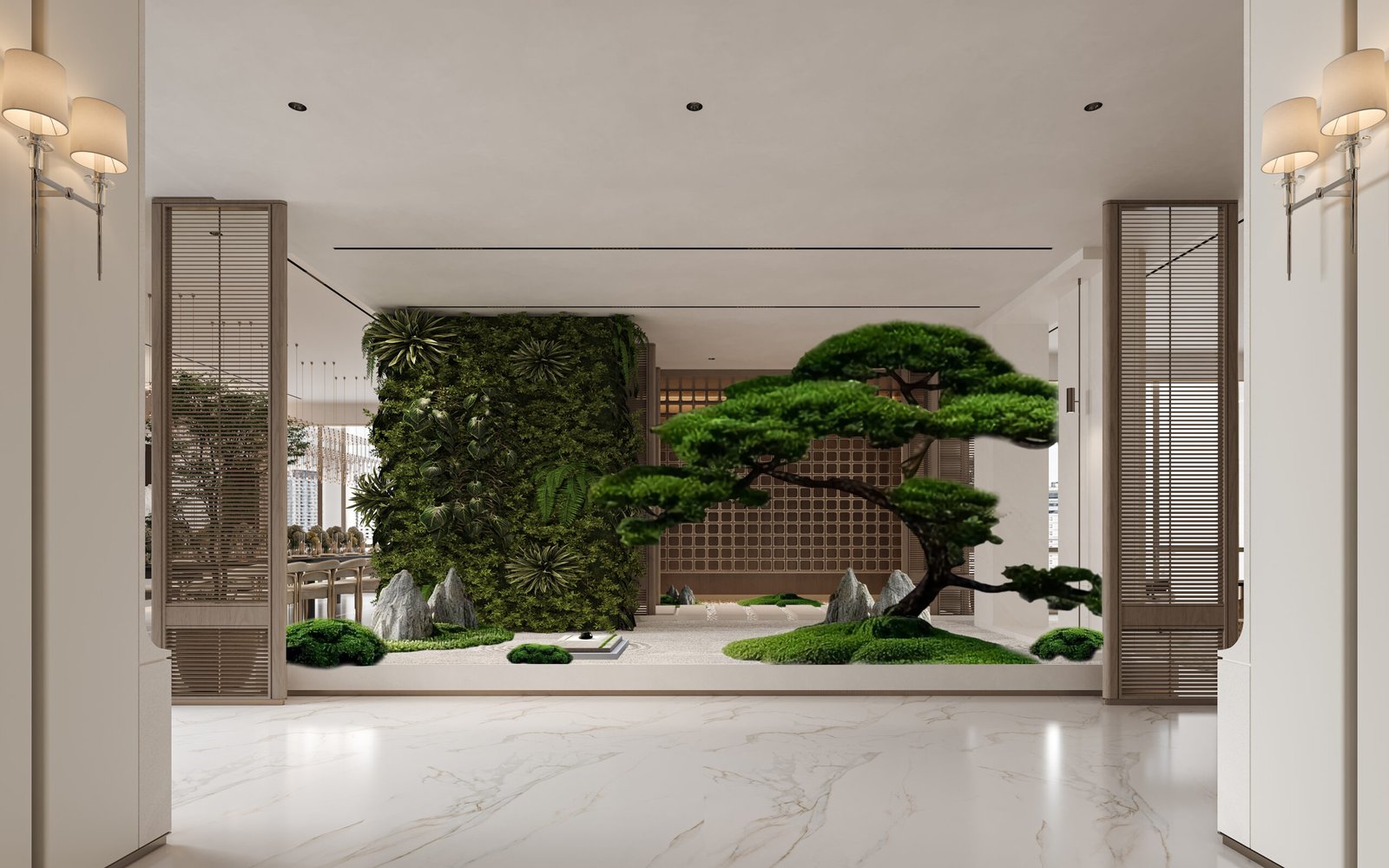 Abstract lobbies with high ceilings feature central trees, curated artwork, comfortable seating, and natural light, enhancing openness and visual drama.