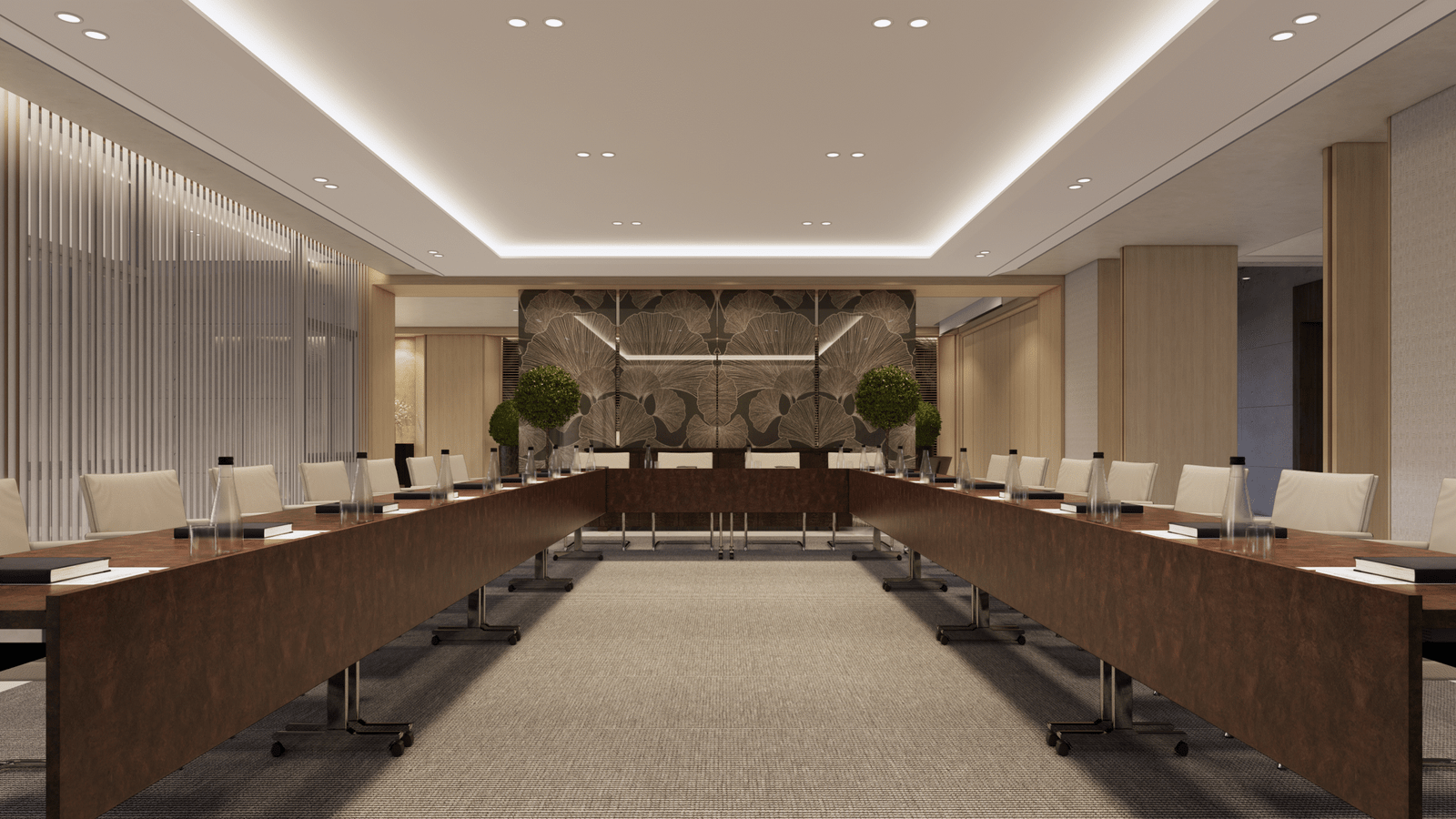 The villa includes modern conference and meeting rooms with long tables, ergonomic chairs, textured walls, and soft lighting—ideal for professional and private meetings.