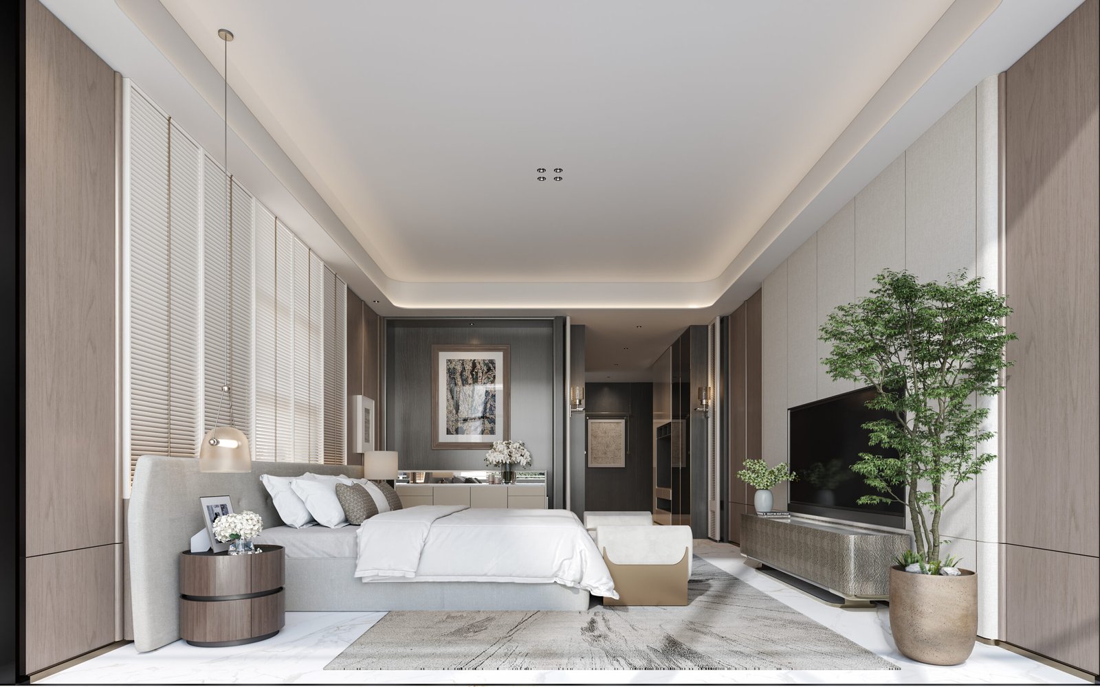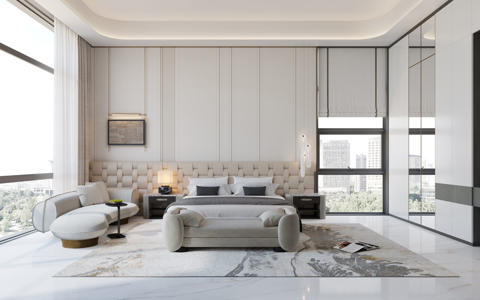 Bedrooms are designed with neutral tones, plush bedding, wooden accents, abstract artwork, and soft ambient lighting. Large windows and carefully selected furniture create a calm, hotel-like atmosphere.