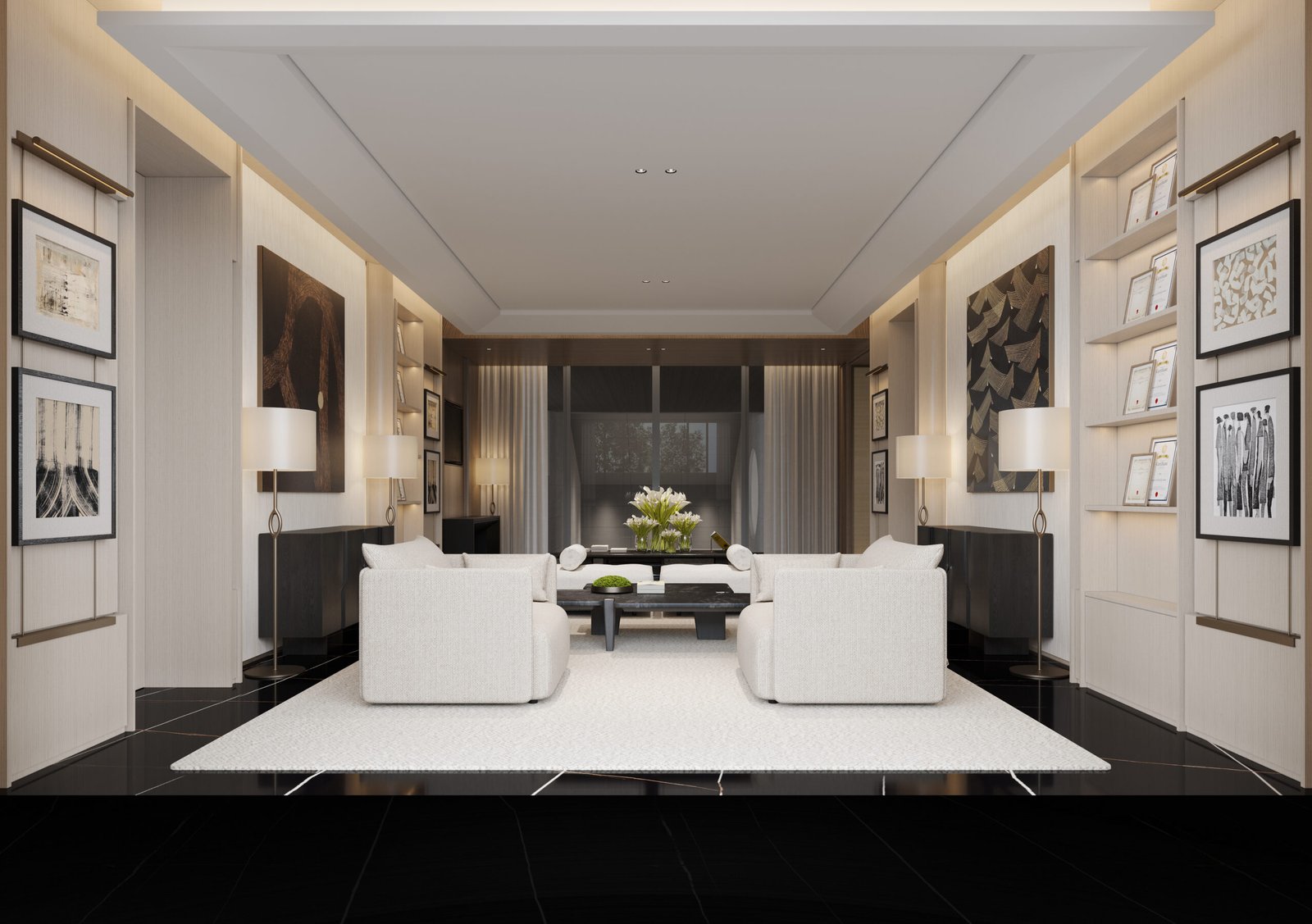 Living rooms are designed with balanced symmetry, neutral color palettes, marble floors, curated artwork, and plush seating. White and beige sofas, elegant lamps, and greenery create a serene yet upscale ambiance.